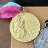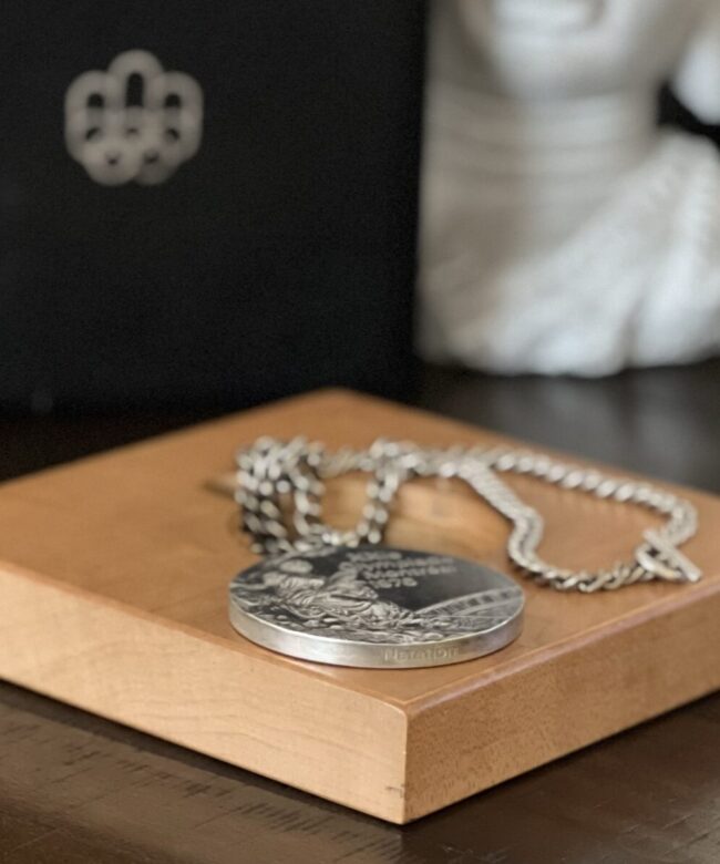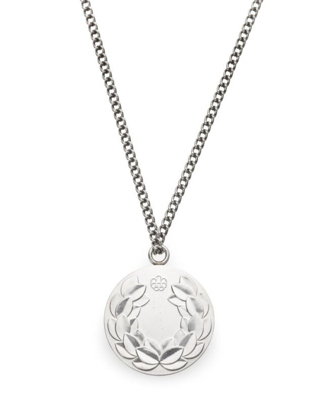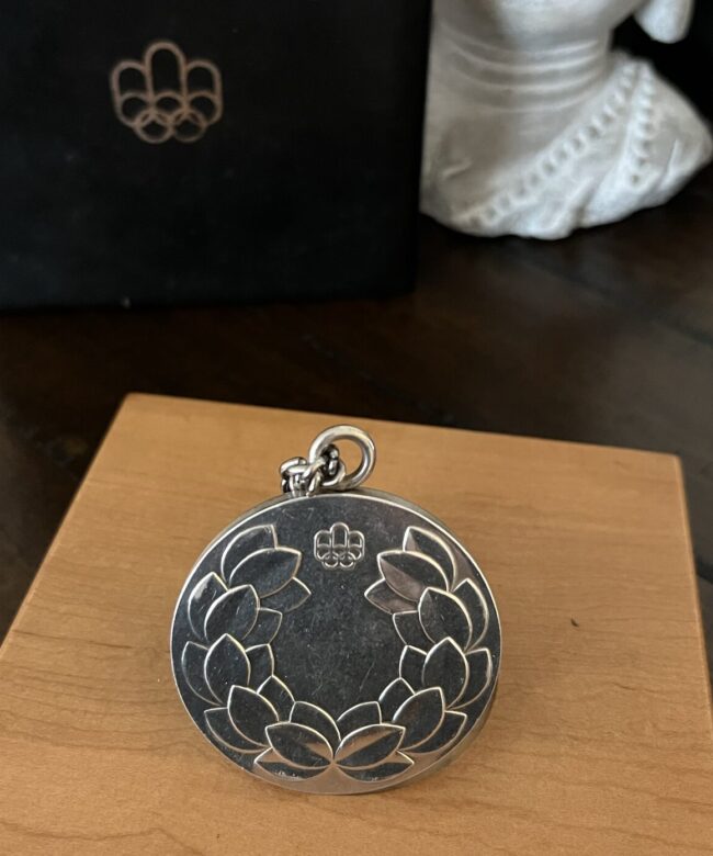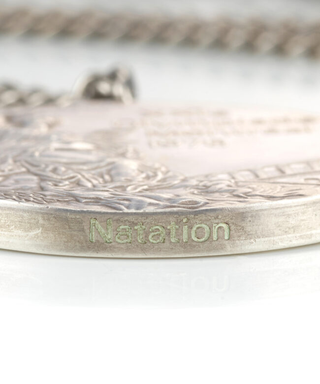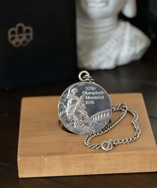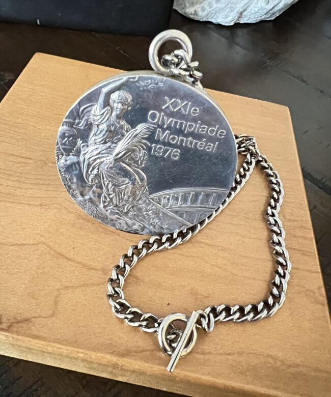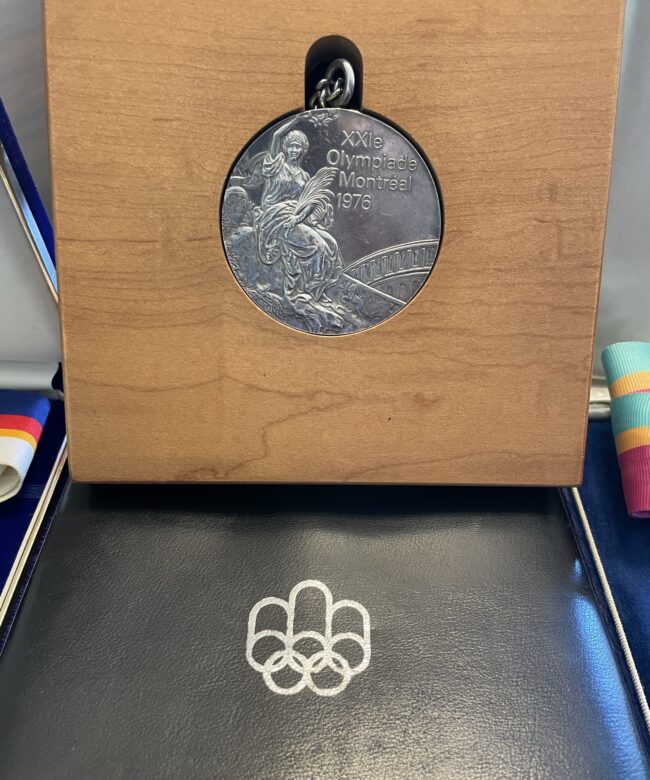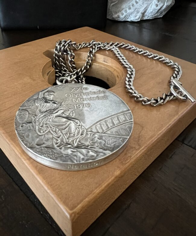 The 1976 Summer Olympic Games took place in Montreal, Canada and was the first Olympics to be held there. The medal comes on the original silver chain and in the wood block and leather case Greg received. The side of the medal is engraved with the event, in this case the French word for swimming, “Natation”.