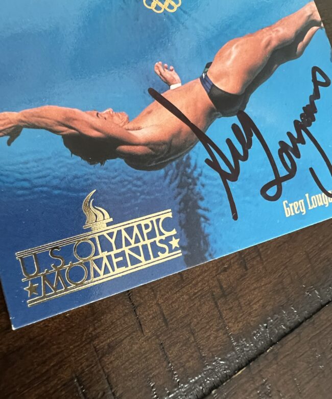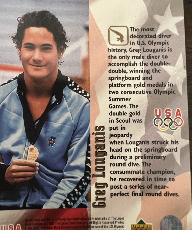 This is an original trading card from Greg’s personal collection, put out by Upper Deck in their Olympic Champions series. This 1996 trading card is in near mint condition.